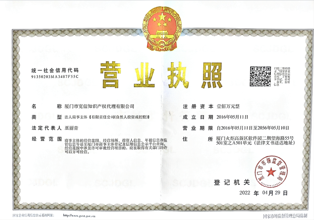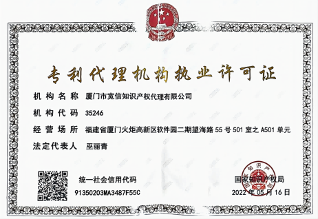 廈門市寬信知識產(chǎn)權(quán)代理有限公司(簡稱:寬信知識產(chǎn)權(quán)),擁有國家知識產(chǎn)權(quán)局審批的專利代理資質(zhì)(機構(gòu)代碼:35246),以及國家商標局備案的商標代理資質(zhì)。
