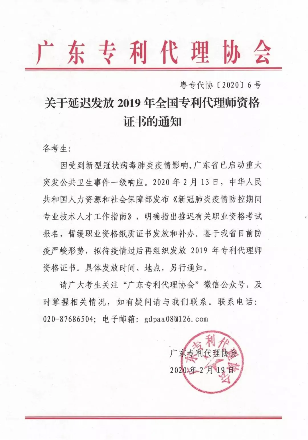 關(guān)于發(fā)放2019年專利代理師資格證書有關(guān)事項的通知