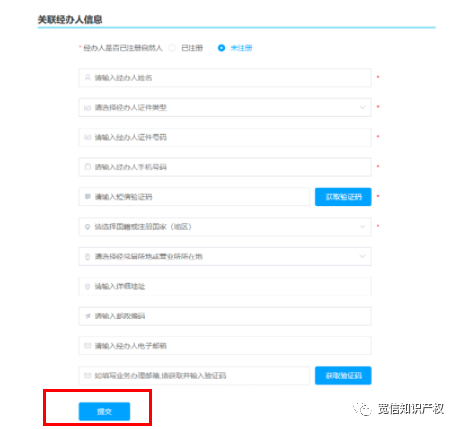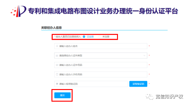 最上方經(jīng)辦人是否已注冊自然人:如經(jīng)辦人有個(gè)人賬號,選擇已注冊輸入注冊信息點(diǎn)擊提交即可。